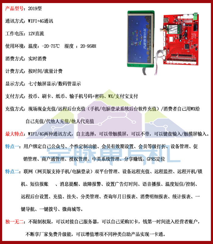 宇脉新品研发——自助洗衣液机主板2019型,数码管/七寸屏两种显示板,自主选择,自由设置参数,权限自由,主控设备自助研发生产,多功能自助设备,支持定制开发,主控设备不定期的升级,享受厂家免费升级功能,宇脉自助设备支持一卡通,统一后台管理。自助售奶机主板功能看图片了解,欢迎来电咨询:18520500709/400-1898-020